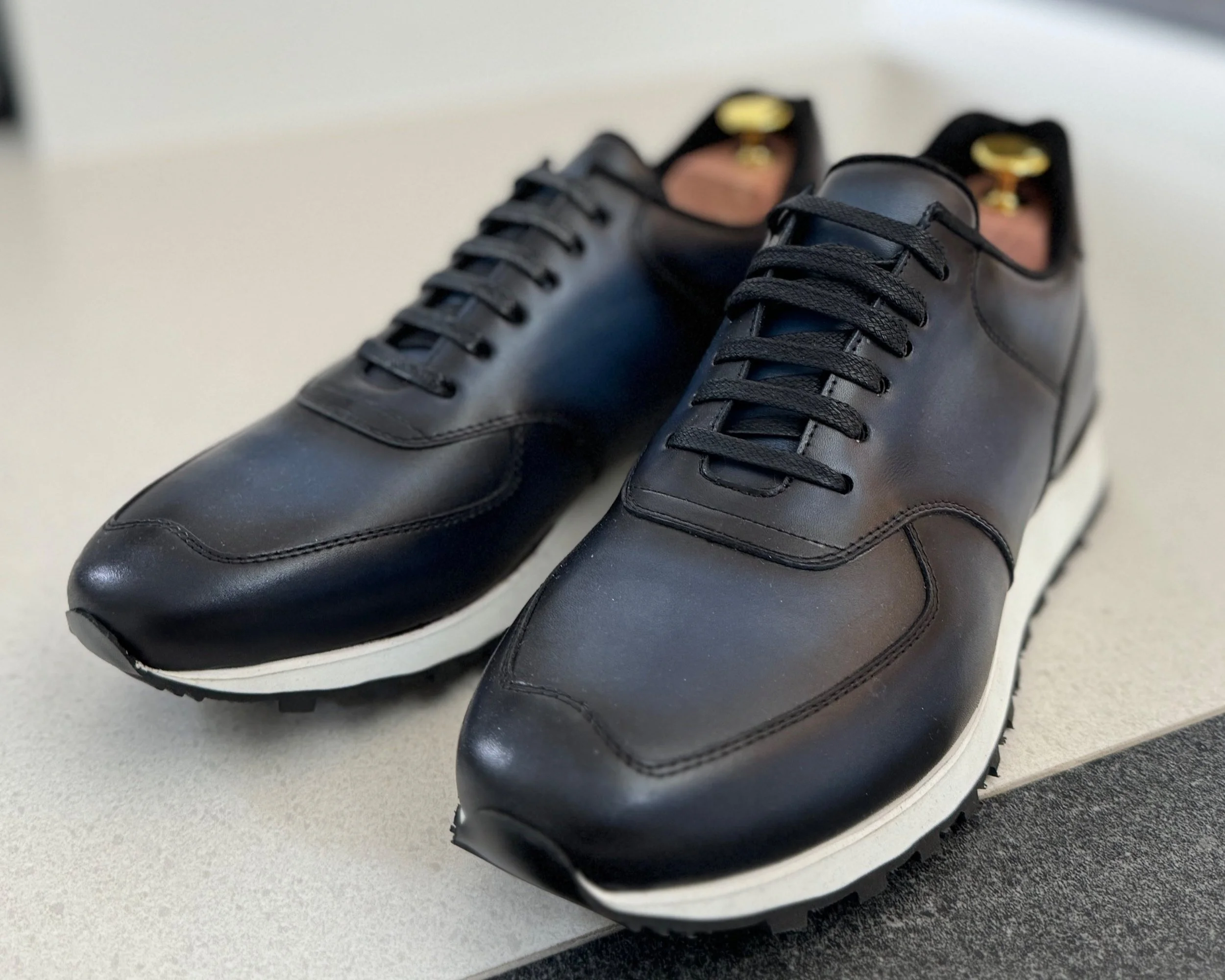 So his definition of dress sneakers is black or brown, white-soled formal training shoes worn with a suit and tie or skinny jeans (which Simon also states is unforgivably naff).