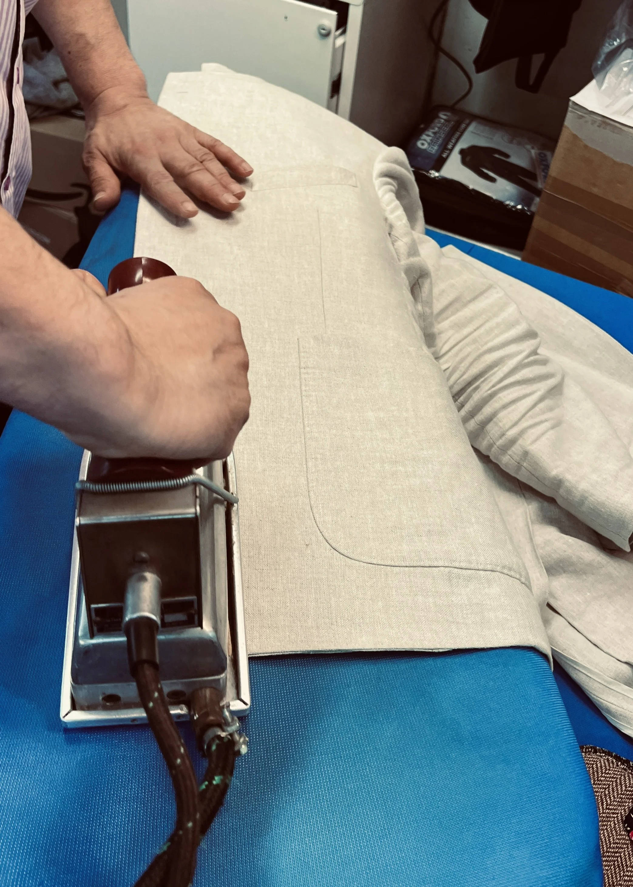 Hand pressing a bespoke linen jacket - the best dry cleaners press by hand: it takes more time but gives the best result!